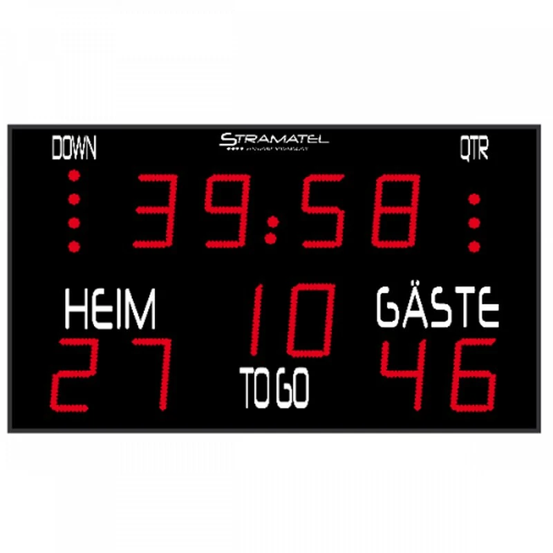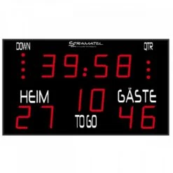 Die Anzeigetafel wurde spezifisch für American Football entwickelt. Die Anzeigetafel besteht aus zwei Modulen. Spielzeit, Spielstand, Quarter, Down und To Go werden angezeigt. Die Zahlen sind 30 cm groß und haben eine Lesbarkeit von 160 m. Die Anzeigetafel wird mit einem Bedienpult und Verkabelung geliefert! Die Übertragung bzw. Bedienung zur Anzeigetafel erfolgt per Funk. Die Helligkeit ist am Steuerpult einstellbar, es stehen 9 verschieden Stufen zur Verfügung.