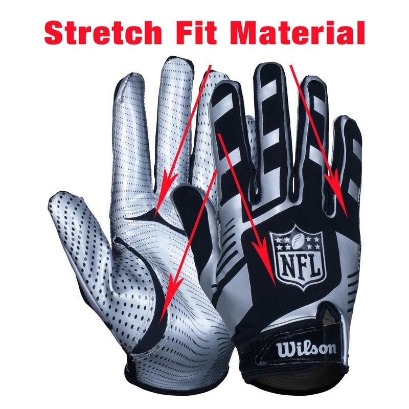 Die Wilson Stretch Fit Receiver Handschuhe haben eine Einheitsgröße. Lästiges Umtauschen fällt damit aus. Die Handschuhe passen von im Größenbereich M bis XL. Die maximale Länge beträgt 20,5 cm. Die eingearbeiteten dehnbaren Trennstellen lassen diese Größenflexibilität zu.